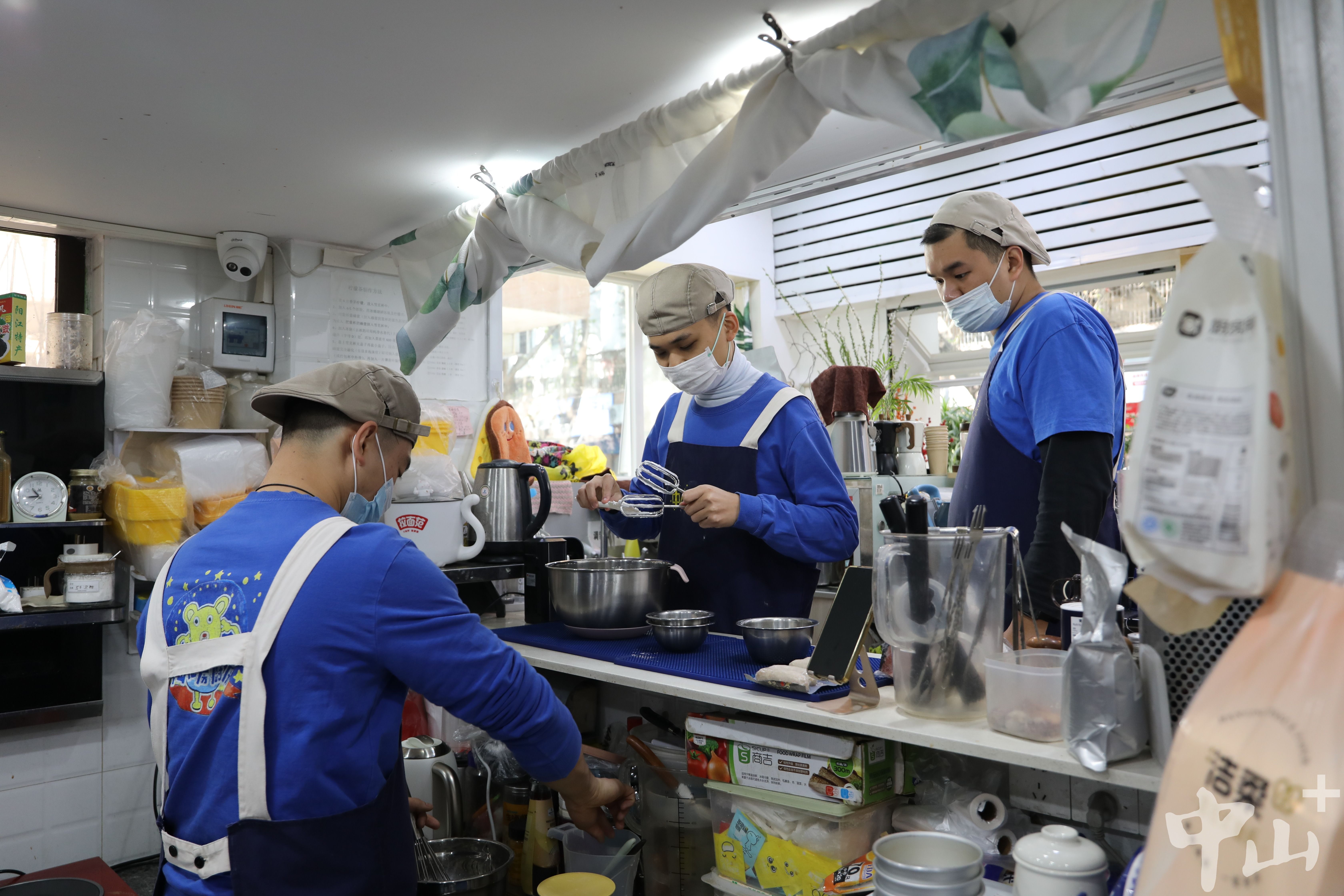 走進(jìn)店內(nèi),幾名年輕人各司其職,忙得不亦樂乎。兩人對照手機(jī)教程準(zhǔn)備制作蛋糕的材料,一人負(fù)責(zé)分離蛋清和蛋黃,一人專注攪拌面粉。經(jīng)過攪拌、烘烤等一道道工序,約1小時(shí)后,幾塊熱氣騰騰的蛋糕新鮮出爐。一旁,身材高挑的男生志軍正忙著準(zhǔn)備午餐?!八麄?nèi)齻€(gè)現(xiàn)在已經(jīng)很熟練了,配合得特別好?!敝拒姷膵寢屝χf道。