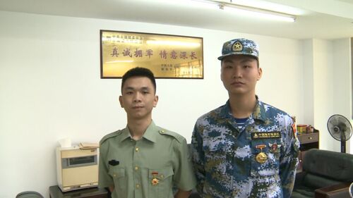 身穿綠色軍裝的叫余英維,旁邊穿迷彩服的是鄧爾康。中學的時候,他們就一起上學,2017年,高中一畢業(yè)就攜手一起報名圓了心里的軍旅夢。