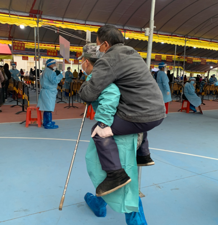 在小欖鎮(zhèn)聯(lián)豐社區(qū)核酸檢測(cè)采樣現(xiàn)場(chǎng),退役軍人吳鴻文背起一位行動(dòng)不便的老人前往核酸采樣工作臺(tái),采樣結(jié)束后,將老人送出場(chǎng)外。臨走的時(shí)候老人連聲向他道謝。 此外,民眾街道退役軍人服務(wù)中心動(dòng)員紅旗志愿服務(wù)隊(duì)退役軍人志愿者分別前往該街道18個(gè)免費(fèi)便民核酸采樣點(diǎn),助力街道開(kāi)展核酸檢測(cè)工作。 |
