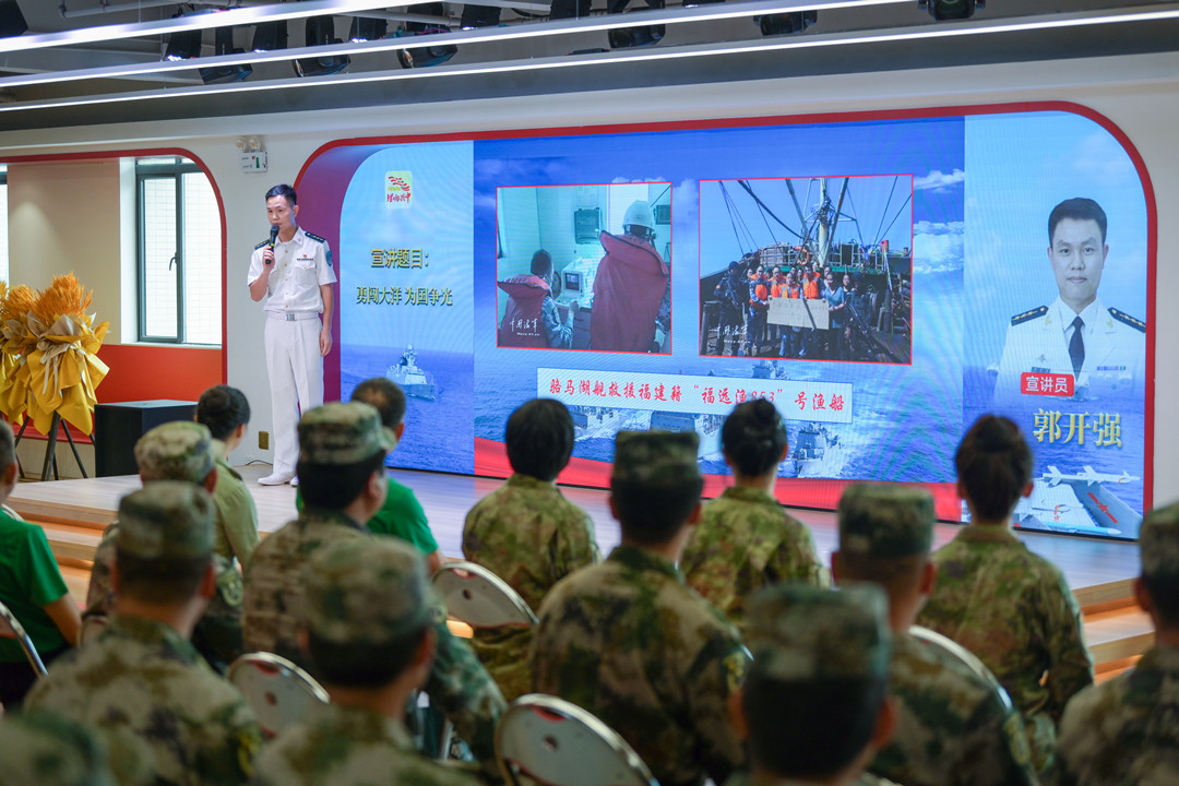 郭開強(qiáng):勇闖大洋 為國爭光 2008年12月,應(yīng)聯(lián)合國授權(quán)請求,奉中央軍委命令,南海艦隊(duì)武漢艦、海口艦、微山湖艦組成第1批護(hù)航編隊(duì),拉開了人民海軍舉世矚目的亞丁灣、索馬里護(hù)航序幕,這是自600多年前鄭和下西洋以來,中國真正意義上的遠(yuǎn)海非戰(zhàn)爭軍事行動,開啟了人民海軍從“黃水”駛向“藍(lán)水”的壯麗航程。 91878部隊(duì)郭開強(qiáng)干事為大家?guī)碇黝}宣講《勇闖大洋 為國爭光》。 郭開強(qiáng)介紹—— 迄今為止,人民海軍已累計(jì)派出44批100余艘次艦艇參加亞丁灣、索馬里海域護(hù)航,完成1500多批7000余艘中外船舶護(hù)航任務(wù),解救、接護(hù)各類船舶近百艘,其中外國船舶超過50%。 護(hù)航官兵一次次直面生死、一次次化解危機(jī)、一次次挑戰(zhàn)極限,用忠誠與奉獻(xiàn)、責(zé)任與擔(dān)當(dāng),彰顯大國海軍形象,譜寫了人民海軍邁向世界一流海軍的新時代壯歌。 張長城分享軍旅故事。記者 易承樂 攝