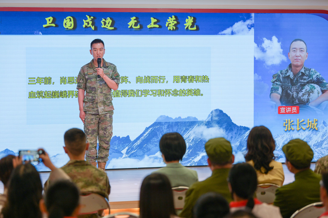 張長城:肖思遠(yuǎn)的名字永遠(yuǎn)留在連隊(duì) “我是69316部隊(duì)加勒萬邊防連‘肖思遠(yuǎn)班’班長張長城,很高興今天有機(jī)會跟大家進(jìn)行交流。三年前,肖思遠(yuǎn)班長兩闖敵陣、向戰(zhàn)而行,用青春和熱血筑起巍峨界碑,是永遠(yuǎn)值得我們學(xué)習(xí)和懷念的英雄……” 張長城現(xiàn)場作了主題為《衛(wèi)國戍邊 無上榮光》的宣講。 張長城說—— 肖班長犧牲后,連隊(duì)組建了“肖思遠(yuǎn)班”,班里有一張肖班長的床,每天晚上,戰(zhàn)士們都會將肖班長的被子打開,早上起床再將被子工工整整的疊好;晚上點(diǎn)名,班里的同志輪流向肖班長匯報本班和個人的工作。 連隊(duì)每天的點(diǎn)名,呼點(diǎn)的第一個名字永遠(yuǎn)是“肖思遠(yuǎn)”,全連齊聲答“到、到、到”,那一刻,感覺下面所有人,望過去都是他! ▌與現(xiàn)場基層干部群眾互動交流