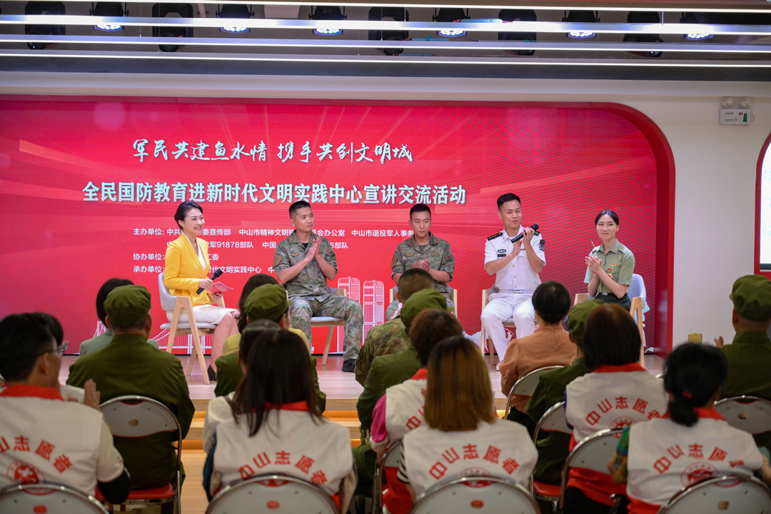 5月18日下午,全民國防教育進(jìn)新時代文明實(shí)踐中心宣講交流活動在中山市民眾街道新時代文明實(shí)踐中心舉行,退役軍人代表、基層群眾、村干部以及受邀出席的中國人民解放軍91878部隊(duì)、69316部隊(duì)官兵代表等200余人參加活動。  活動現(xiàn)場。記者 易承樂 攝