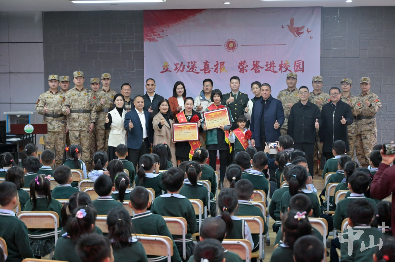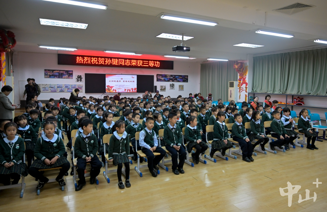 拉橫幅、敲鑼鼓、舞龍獅……2月29日一早,東區(qū)街道竹苑社區(qū)迎來了一支敲鑼打鼓、舞龍舞獅的隊(duì)伍,一路喜氣洋洋,熱鬧非凡。游行隊(duì)伍將一份立功受獎(jiǎng)的榮譽(yù),帶到了榮立三等功的現(xiàn)役軍人孫鍵女兒孫頌雅所在的竹苑小學(xué),熱鬧的場面吸引許多鄉(xiāng)親、商戶等前來圍觀祝賀。 聯(lián)合送喜報(bào),儀式感拉滿 校園內(nèi),在讀小學(xué)一年級(jí)的“軍娃”孫頌雅和她的同學(xué)、老師等共同見證了這一榮耀時(shí)刻。東區(qū)街道黨工委書記周俊峰將三等功喜報(bào)送到孫頌雅一家人手上,市退役軍人事務(wù)局黨組成員、副局長陳光林為他們送上慰問金,并為其佩戴光榮綬帶“一人立功,全家光榮”,一家人臉上洋溢著開心且自豪的笑容。  孫頌雅一家人在學(xué)校收到立功喜報(bào)。記者 易承樂 攝