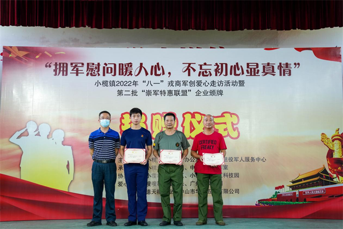 ▲小欖鎮(zhèn)2022年“八一”愛心走訪活動啟動現(xiàn)場。 活動現(xiàn)場,相關(guān)領(lǐng)導(dǎo)為贊助本次走訪活動的4家愛心企業(yè)和小欖鎮(zhèn)第二批加入中山市“崇軍特惠聯(lián)盟”的10家企業(yè)代表逐一頒發(fā)紀(jì)念牌,并為該鎮(zhèn)3位“中山市老兵宣講團(tuán)”成員——?dú)W耀強(qiáng)、蔡永志、張昊明頒發(fā)聘書。隨后,榮立一等功的老兵歐耀強(qiáng)用樸實(shí)而生動的語言講述自己如何帶領(lǐng)身邊戰(zhàn)友在艱苦的環(huán)境下堅持戰(zhàn)斗取得勝利,和大家分享自己10年軍旅生涯的點(diǎn)點(diǎn)滴滴。歐耀強(qiáng)勉勵大家把責(zé)任和忠誠作為重要精神支柱、以主人翁的心態(tài)愛護(hù)我們的家園。