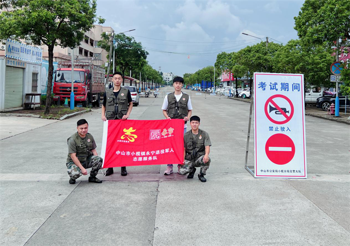 沙溪鎮(zhèn)退役軍人志愿者和民兵協(xié)助公安交警開展高考護(hù)航工作。 7日早上7時(shí)許,在沙溪鎮(zhèn)寶珠東路龍山中學(xué)路口,多名退役軍人紅旗志愿服務(wù)隊(duì)隊(duì)員和民兵協(xié)助公安交警在路口設(shè)立警戒線,做好交通疏導(dǎo)、公共秩序維護(hù)、卡點(diǎn)值守等服務(wù),同時(shí)為考生及家長提供礦泉水、應(yīng)急救援等服務(wù),給考生營造一個(gè)安全、寧靜、有序、文明的考試環(huán)境。 在中山市桂山中學(xué)門口,三鄉(xiāng)鎮(zhèn)退役軍人志愿者和民兵按照事先分工安排,分散在各個(gè)交通路口,有的拉警戒線,有的指揮車輛通行,有的疏散人群,有的負(fù)責(zé)在助力點(diǎn)發(fā)放礦泉水,他們精神抖擻,干勁十足,積極協(xié)助公安民警,做好考場(chǎng)周邊交通秩序維護(hù),確??荚嚻陂g考場(chǎng)周邊環(huán)境安靜有序。