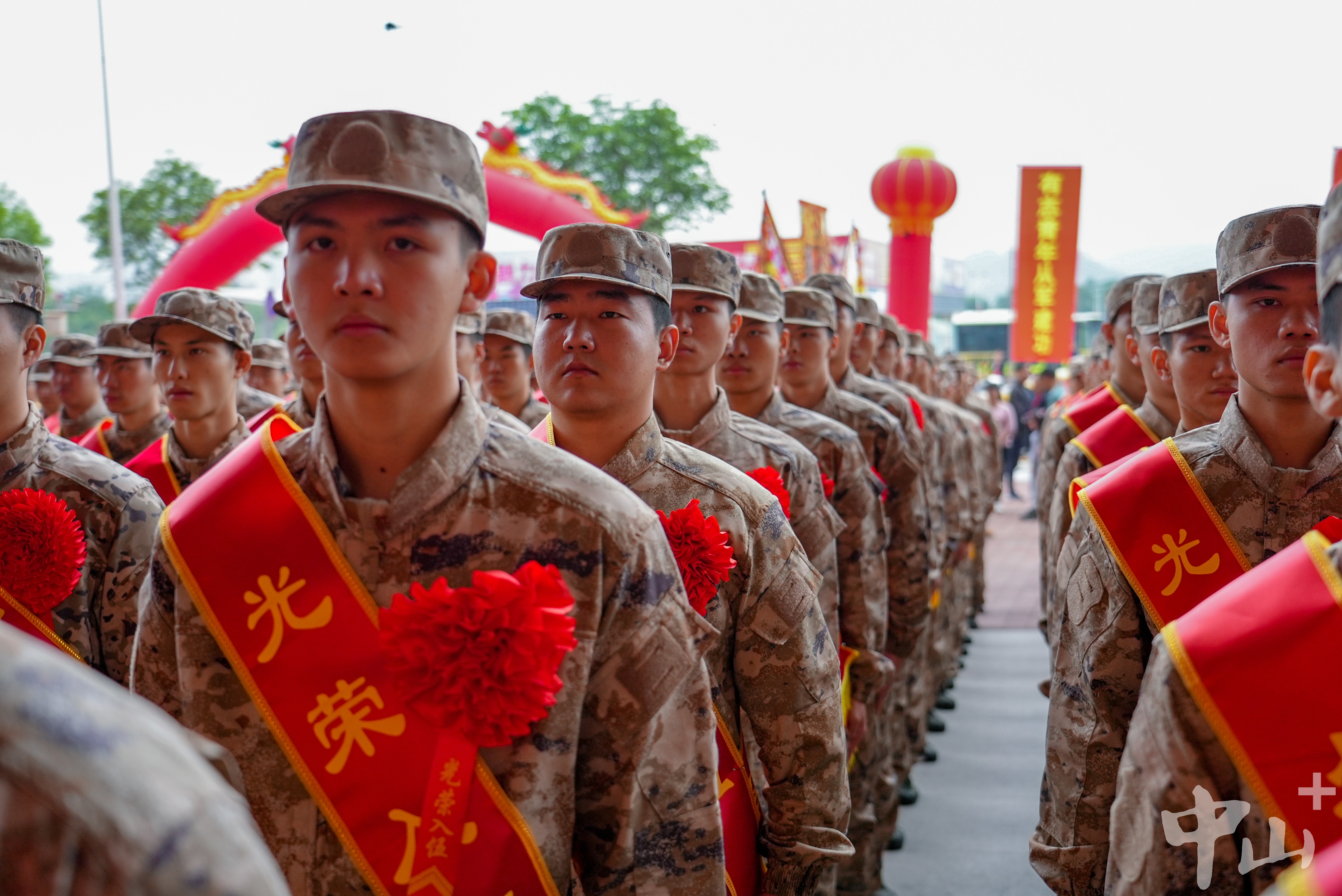 中山市征兵工作領(lǐng)導(dǎo)小組副組長(zhǎng)、中山軍分區(qū)大校司令員李云濤,中山市征兵工作領(lǐng)導(dǎo)小組副組長(zhǎng)、中山軍分區(qū)大校政治委員朱月明,市征兵辦副主任、市政府副秘書長(zhǎng)梁克等出席大會(huì)。 歡送現(xiàn)場(chǎng),新兵們?nèi)盅b整肅,身披“光榮入伍”的紅色綬帶,胸戴紅花,精神抖擻、軍姿挺拔。   新兵們?nèi)盅b整肅,精神抖擻、軍姿挺拔。記者 易承樂 攝