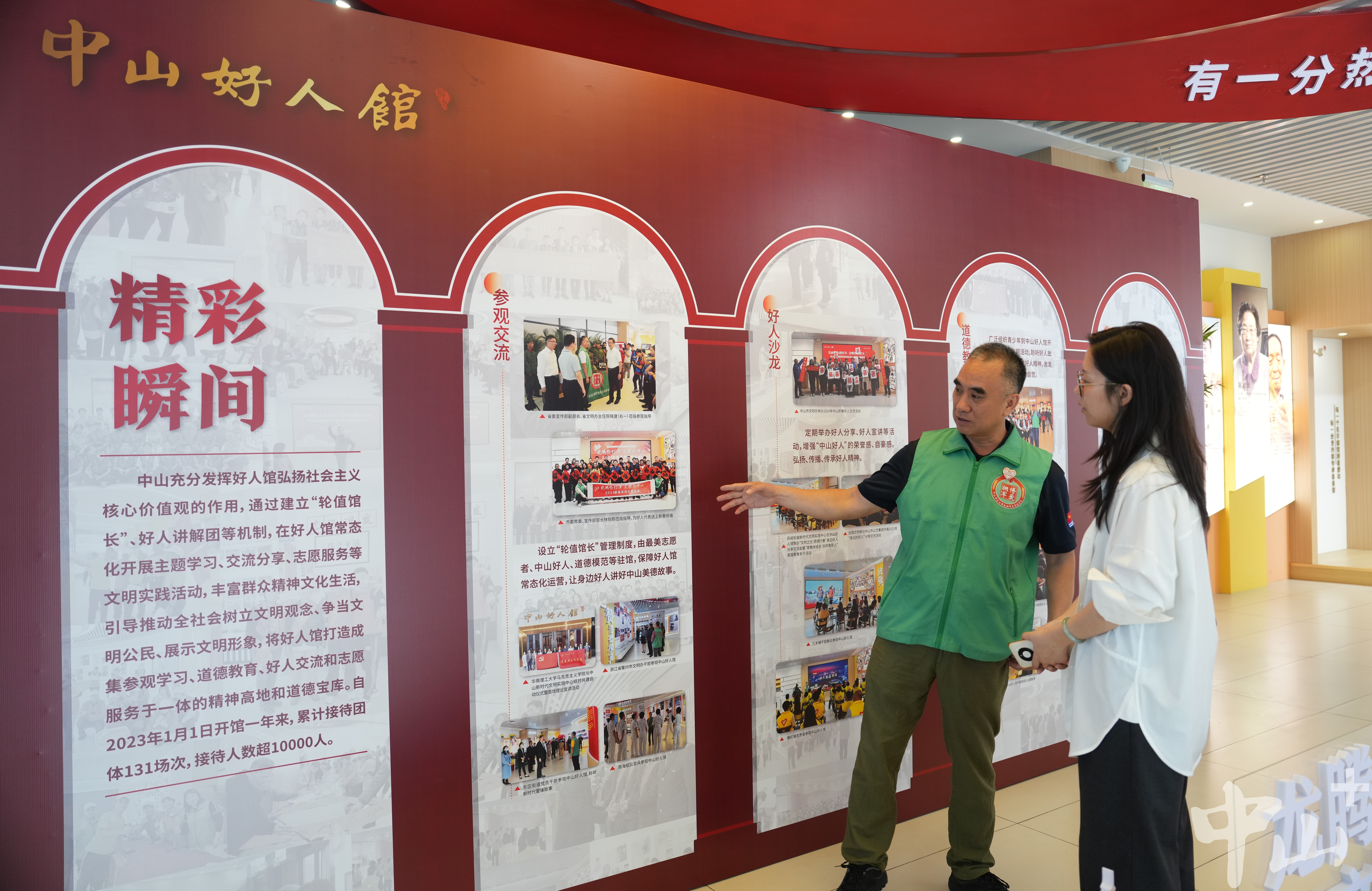 作為一名退伍軍人,李克有很多曾一起在戰(zhàn)場上出生入死的戰(zhàn)友,其中不乏已經(jīng)為國捐軀的烈士。自2007年起,他便自發(fā)組織尋找犧牲的中山籍戰(zhàn)友,先后6次帶隊前往廣西邊境的多個烈士陵園,成功尋到29名犧牲戰(zhàn)友信息,并將相關(guān)信息報送給中山市退役軍人事務(wù)局。 “我有一位戰(zhàn)友,寧愿把生的希望留給其他人,19歲不到就犧牲在戰(zhàn)場上。他們已經(jīng)離我們而去,更重要的是我們能為他們做些什么。所以逢年過節(jié)我都會看望他們的家人,把歡樂也帶給老人家。”李克說。 2016年,得知戰(zhàn)友的女兒患先天性心臟病,須進行心肺聯(lián)合移植手術(shù),李克立即帶頭捐款,并聯(lián)系政府相關(guān)部門和電視臺,通過媒體報道讓更多愛心人士關(guān)注到了這位困難老兵。在他的多方奔走下,社會各界紛紛伸出援助之手,募集醫(yī)藥費40余萬元,助戰(zhàn)友的女兒順利完成了手術(shù)。 牽頭成立志愿服務(wù)隊 延續(xù)志愿精神 作為一名有著30多年志愿服務(wù)經(jīng)歷的資深志愿者,李克的生活已經(jīng)與志愿分不開。他的身上始終有一抹綠色:在軍營,是守衛(wèi)國門的綠軍裝;在社區(qū),是服務(wù)群眾的綠馬甲。在人民群眾需要的地方,李克每次都沖在最前線。 “2020年疫情暴發(fā)時,很多人都響應(yīng)號召待在家里,我覺得作為一個打過仗的老兵,我總得站出來做點事。”沒有過多考慮,李克第一時間加入到了志愿者隊伍中,并在社區(qū)堅守了整整60天。當(dāng)時防護物資匱乏,李克還自掏腰包托人在廣州購買了6萬元左右的防護物資,全部捐贈給了在一線抗疫的工作人員。 近年來,李克還積極捐資助學(xué)、支援災(zāi)區(qū)、扶危濟困,連續(xù)6年資助6名困難學(xué)生,為汕尾市陸河中學(xué)捐贈10套多媒體電腦設(shè)備,堅持參與無償獻血直到60歲。 2018年起,李克擔(dān)任文明城市巡查監(jiān)督員,奔走在街道各個路口、每條小巷,整理亂停亂放的共享單車,清理“牛皮癬”小廣告,保障街頭巷尾干凈衛(wèi)生。同一年,為更有組織地開展志愿活動,李克牽頭成立了一支以退役軍人為主導(dǎo)的東區(qū)博愛擁軍志愿服務(wù)隊,把戰(zhàn)友們凝聚在一起,共同為社會作貢獻。如今,這支志愿服務(wù)隊已從最初的8名成員,逐漸壯大至400多人,成為服務(wù)社會的一支生力軍。 講好好人故事,傳承紅色文化 4月19日上午,記者在“中山好人館”見到了正在擔(dān)任“輪值館長”的李克。從去年1月開始,他每個月都參與輪值,先后為140多場活動、1萬多名市民群眾義務(wù)講解博愛之城的凡人善舉、好人大愛。  正在中山好人館輪值的李克。記者 劉萬杰 攝
