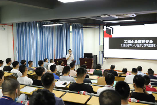 “狹路相逢勇者勝,在座的各位從繁忙的工作崗位上走出來,邁出繼續(xù)學習的關(guān)鍵一步,勇氣可嘉。三年后,相信大家一定會收獲知識、技能、學歷,更好地開啟新征程。”退役軍人現(xiàn)代學徒制項目開學典禮上,經(jīng)管學院院長肖紅在致辭中對新生們表示歡迎和祝賀,并表達了殷切期望,希望大家在求學期間,修德修身、克勤克儉、心懷理想,腳踏實地,融入多姿多彩的校園生活,在學生當中彰顯軍人本色和榜樣力量。 市退役軍人事務局相關(guān)負責人對項目順利開班表示祝賀,對學院在項目申報、招生等工作中的辛勤付出表示衷心感謝。他介紹了項目實施的背景,指出開展退役軍人現(xiàn)代學徒制教育,是退役軍人安置工作的一項重要內(nèi)容,通過現(xiàn)代學徒制,讓大家成為全日制大學生,進行正規(guī)系統(tǒng)的高等職業(yè)教育,是黨和政府送給同學們的一份沉甸甸的“大禮包”。同時,要求新生們盡快適應由士兵到大學生的角色轉(zhuǎn)變,勤學善思,掌握就業(yè)創(chuàng)業(yè)本領(lǐng),發(fā)揚軍隊能打勝仗的優(yōu)良傳統(tǒng),爭創(chuàng)佳績,為祖國和地方經(jīng)濟建設(shè)再立新功。 學院工商管理專業(yè)主任沈孟康介紹了學校和學院概況,就學生日常管理、教學內(nèi)容、方式和計劃等作詳細說明。表示學校將采取在崗培養(yǎng)與學校培養(yǎng)相結(jié)合,堅持“標準不降、模式多元、學制靈活”,線上與線下混合教學,實行工學交替、靈活多元的教學模式。經(jīng)管學院已配備了教授、博士等“精銳”師資團,“量身定制”人才培養(yǎng)方案,全力保障“八一班”的教育教學質(zhì)量。
