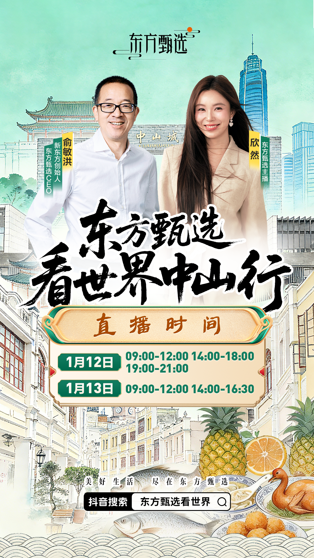1月12日-13日,歡迎廣大網(wǎng)友鎖定東方甄選App、抖音“東方甄選看世界”直播間,跟隨俞敏洪和主播欣然的腳步,體驗(yàn)偉人故里,人文中山,解鎖中山這座城市的鮮活底蘊(yùn)。