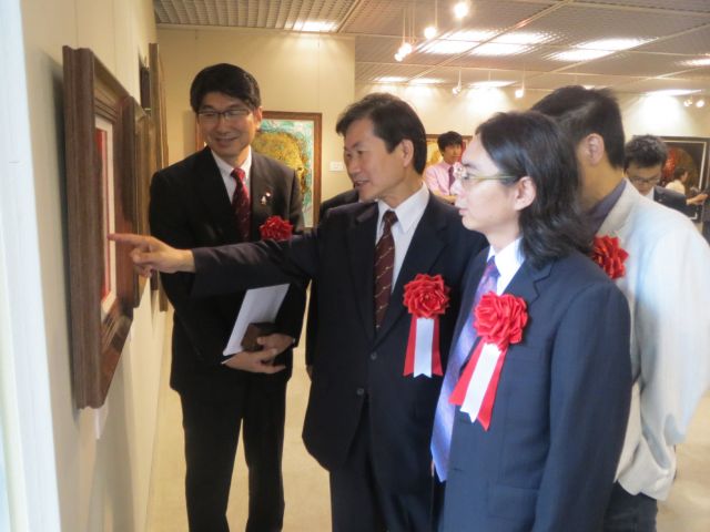 中山市教育考察團(tuán)成員向田上市長、馬場教育委員長展示中山市小學(xué)生作品
