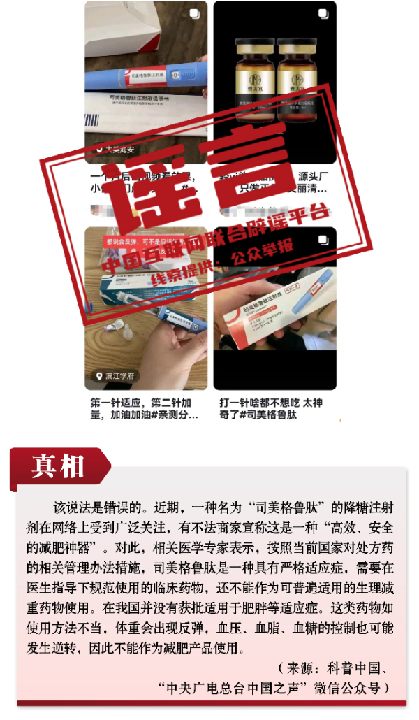 有關(guān)呼吸道疾病防治的謠言和誤區(qū)誤導(dǎo)公眾。隨著各地陸續(xù)入冬,呼吸道疾病進(jìn)入高發(fā)季節(jié),多種呼吸道疾病交織疊加,難免讓人焦慮。恰在此時(shí),網(wǎng)上一些治病養(yǎng)生醫(yī)藥“偏方”頻出,一些自媒體假借專業(yè)人士和醫(yī)生網(wǎng)上“開(kāi)方”,真假難辨、誤導(dǎo)公眾。如“感染肺炎支原體會(huì)得肺炎、會(huì)出現(xiàn)‘白肺’”“可自行給孩子服用阿奇霉素等藥物以預(yù)防支原體肺炎”“可網(wǎng)上購(gòu)買‘醫(yī)院同款’霧化器在家自療”等謠言,抓住人們對(duì)疾病的恐懼心理大肆傳播,有的耽誤正常治療,有的則是“假科普、真帶貨”。此外,“使用司美格魯肽能輕松減肥”的謠言,無(wú)視權(quán)威部門對(duì)處方藥的相關(guān)管理辦法措施,此類藥品若盲目使用或者使用不當(dāng),存在很大健康風(fēng)險(xiǎn)。
