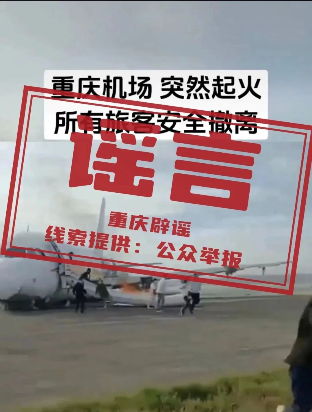 網(wǎng)傳信息為發(fā)布于某網(wǎng)站平臺(tái)的一條短視頻,視頻畫面顯示一客機(jī)停放在飛機(jī)跑道上,不少乘客正從飛機(jī)客艙中跑出,并配文稱“重慶機(jī)場突然起火,所有旅客安全撤離”。