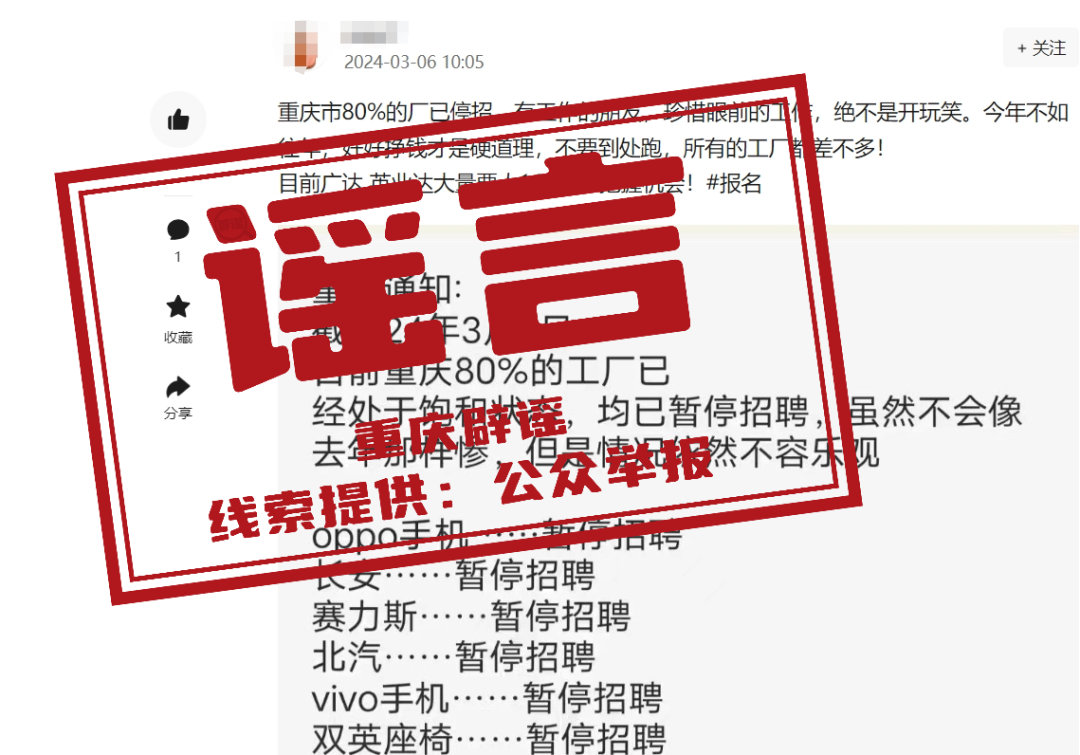 近日,有網(wǎng)民在某網(wǎng)絡(luò)平臺上發(fā)布信息:“目前重慶市80%的廠已處于飽和狀態(tài),均已暫停招聘”,引發(fā)社會關(guān)注。經(jīng)相關(guān)部門核實(shí),網(wǎng)傳信息為謠言。