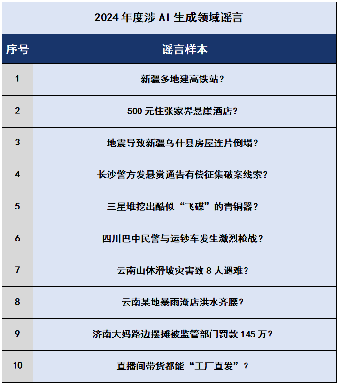2024年初,“新疆多地建高鐵站”虛假短視頻在網(wǎng)上流傳,此類(lèi)視頻由軟件智能合成,用戶(hù)只需使用指定視頻模板、手動(dòng)替換涉本人家鄉(xiāng)相關(guān)地點(diǎn)的文字即可生成新視頻,利用人們對(duì)家鄉(xiāng)基礎(chǔ)設(shè)施建設(shè)情況的關(guān)注而大肆傳播,誤導(dǎo)公眾。還有個(gè)別網(wǎng)民為獲取流量和不當(dāng)利益,利用AI軟件蓄意歪曲“交警請(qǐng)占道停留的運(yùn)鈔車(chē)駛離”的事實(shí),編造謠言“四川巴中民警與運(yùn)鈔車(chē)發(fā)生激烈槍?xiě)?zhàn)”,造成公眾恐慌和誤解。此外,謠言“濟(jì)南大媽路邊擺攤被監(jiān)管部門(mén)罰款145萬(wàn)”實(shí)為AI工具生成的虛假文章,大肆消費(fèi)公眾的同情心博取眼球,引發(fā)大范圍傳播,造成不良社會(huì)影響,相關(guān)違法人員被公安機(jī)關(guān)依法行政拘留?!霸颇仙襟w滑坡災(zāi)害致8人遇難”“地震導(dǎo)致新疆烏什縣房屋連片倒塌”“云南某地暴雨淹店洪水齊腰”等謠言則純屬子虛烏有,均為AI特效炮制的虛假視頻,利用公眾對(duì)災(zāi)難事件的重視編造傷亡情況,制造恐慌情緒,擾亂社會(huì)秩序。