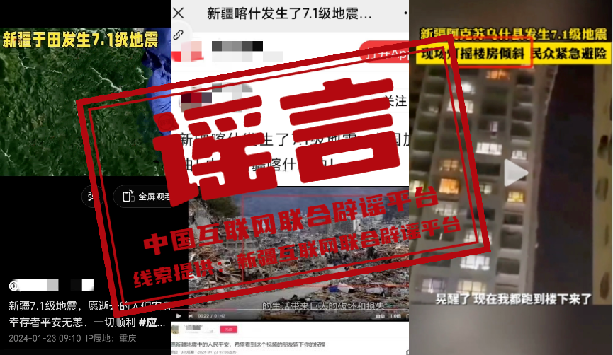 詳情:1月23日2時(shí)9分,新疆阿克蘇地區(qū)烏什縣發(fā)生7.1級(jí)地震。隨后,關(guān)于此次地震的各種不實(shí)信息在網(wǎng)絡(luò)上傳播,混淆視聽(tīng)、引發(fā)關(guān)注。針對(duì)“新疆喀什發(fā)生7.1級(jí)地震”“新疆和田地區(qū)于田縣發(fā)生7.1級(jí)地震”的網(wǎng)傳信息,經(jīng)喀什市應(yīng)急管理局和于田縣應(yīng)急管理局證實(shí),1月23日兩地均未發(fā)生地震,信息為虛假不實(shí)內(nèi)容;針對(duì)“阿克蘇某小區(qū)樓被地震晃歪了”的圖文信息,經(jīng)相關(guān)部門核實(shí),圖片中的建筑物為阿克蘇市鳳凰城小區(qū)居民樓,排查暫未發(fā)現(xiàn)地震造成該樓體傾斜,網(wǎng)傳圖片系建筑物樓體設(shè)計(jì)和拍攝角度造成的樓體傾斜視覺(jué)錯(cuò)誤;針對(duì)上述圖片和視頻顯示的“烏什縣路面損毀嚴(yán)重、房屋連片倒塌”相關(guān)信息,經(jīng)查是網(wǎng)民利用AI自動(dòng)生成技術(shù),將烏什縣7.1級(jí)地震有關(guān)信息與網(wǎng)絡(luò)舊圖合成的虛假信息。中國(guó)互聯(lián)網(wǎng)聯(lián)合辟謠平臺(tái)提醒廣大網(wǎng)民,以官方發(fā)布信息為準(zhǔn),自覺(jué)抵制網(wǎng)絡(luò)謠言。(來(lái)源:“和田網(wǎng)絡(luò)舉報(bào)辟謠”微信公眾號(hào)、“喀什市零距離”微信公眾號(hào)、“阿克蘇網(wǎng)絡(luò)舉報(bào)”微信公眾號(hào))