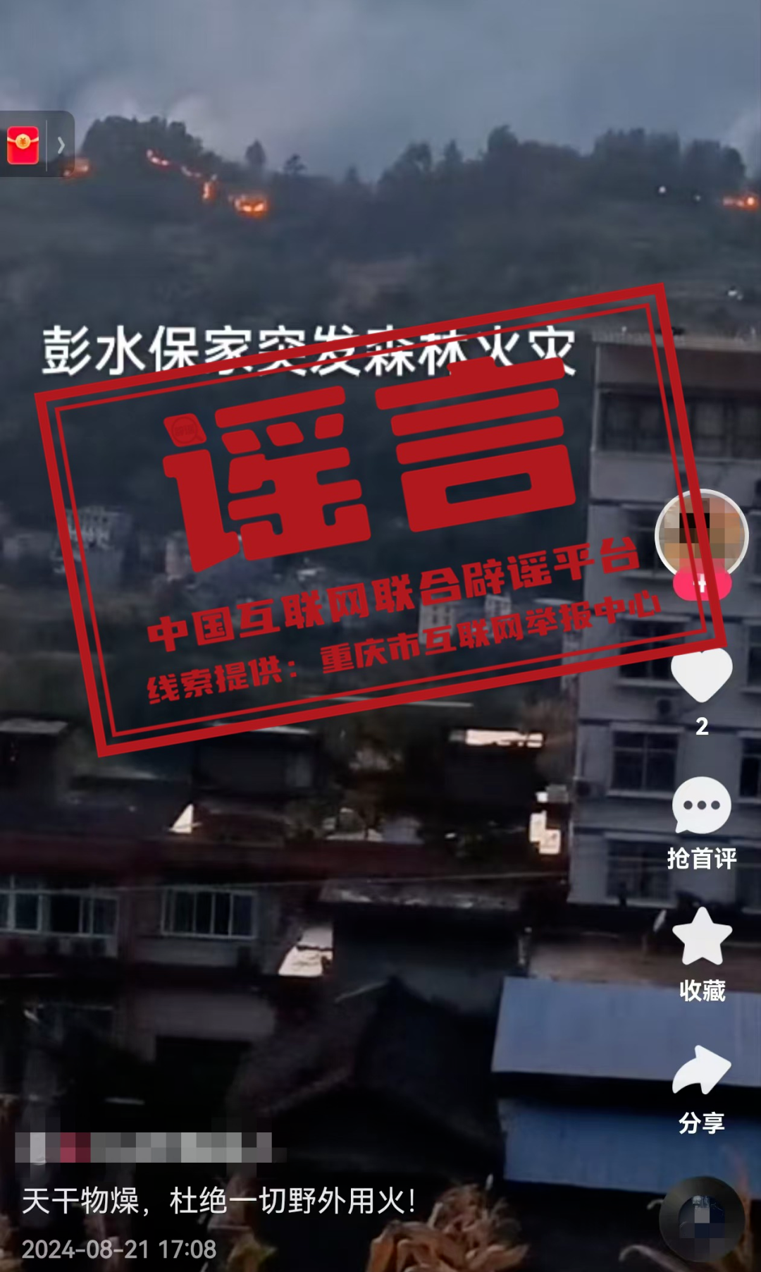 真相:8月21日,某網(wǎng)民發(fā)布視頻并配文“彭水保家突發(fā)森林火災(zāi)”,引發(fā)關(guān)注。經(jīng)屬地網(wǎng)信部門核實(shí),重慶彭水近期未發(fā)生此類事件,網(wǎng)傳信息系謠言。目前,謠言線索已轉(zhuǎn)交相關(guān)部門對造謠者進(jìn)行進(jìn)一步調(diào)查處置。(來源:@重慶辟謠)