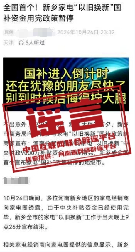 謠 言 河南新鄉(xiāng)家電“以舊換新”國家補(bǔ)貼資金用完、政策暫停?