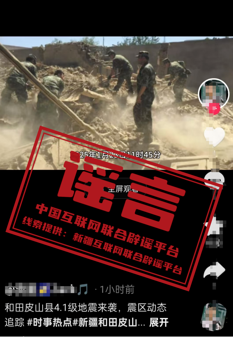 真相:中國地震臺網(wǎng)正式測定,2025年01月23日11時45分在新疆皮山縣(緯度36.94°,經(jīng)度78.87°)發(fā)生4.1級地震,震源深度15公里,震中附近地形類型為山地,5公里范圍內(nèi)平均海拔高度為2484米,距離皮山縣92公里。個別網(wǎng)民關聯(lián)此次地震,發(fā)布“房屋倒塌、道路坍塌及應急救援”等謠言圖片和短視頻,博取流量誤導網(wǎng)民。經(jīng)皮山縣應急管理局核實,此次地震未造成人員傷亡及財產(chǎn)損失。對編造散布地震謠言擾亂公共秩序、造成惡劣社會影響的行為,公安機關將依法依規(guī)嚴肅查處。請廣大網(wǎng)民擦亮眼睛,勿輕信傳播非正規(guī)來源、未經(jīng)證實的地震信息。(來源:新疆網(wǎng)絡辟謠)