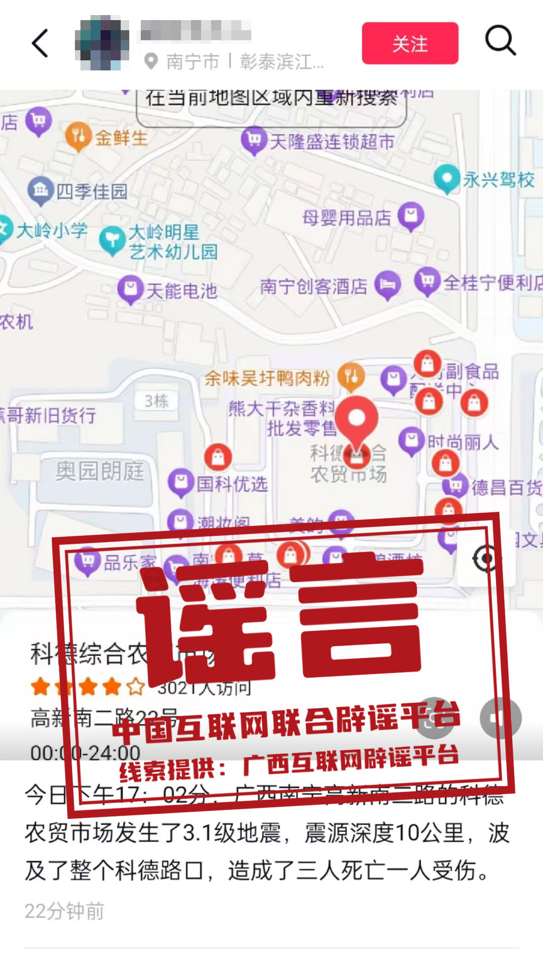 真相:2月12日,有網(wǎng)民在某短視頻平臺發(fā)文稱“今日下午17:02分,廣西南寧高新南二路的科德農貿市場發(fā)生了3.1級地震?!苯浵蛴嘘P部門核實,此信息為謠言。據(jù)廣西地震臺網(wǎng)和南寧市地震監(jiān)測中心數(shù)據(jù)顯示,南寧市及其鄰區(qū)無有感地震發(fā)生,亦無震情和災情信息反饋。目前,謠言線索已轉交相關部門對造謠者進行進一步調查處置。(來源:“廣西互聯(lián)網(wǎng)違法和不良信息舉報”微信公眾號、南寧市互聯(lián)網(wǎng)舉報·辟謠平臺)