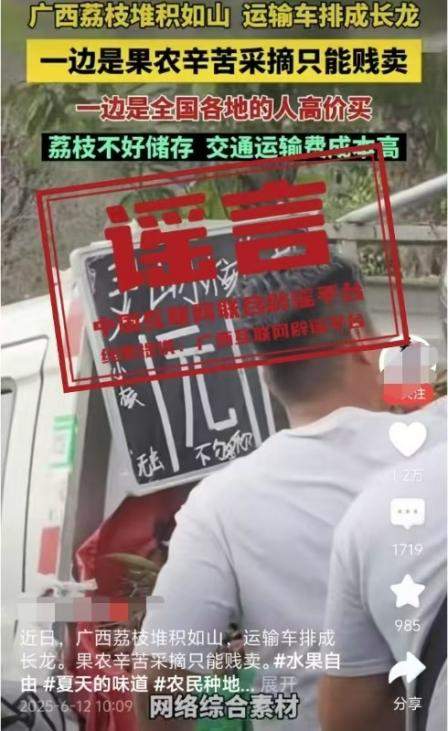 真相:6月12日,網傳“近日廣西荔枝堆積如山,運輸車排成長龍。果農辛苦采摘只能賤賣”的視頻,畫面顯示荔枝堆積和“靈山荔枝1元”字樣。經核查,視頻內容并非發(fā)生在靈山縣。目前,靈山荔枝“妃子笑”等中熟品種逐漸批量上市,大規(guī)模上市時間為6月20日左右,當前荔枝產銷有序開展,并未發(fā)現(xiàn)個別媒體報道的“荔枝滯銷賤賣”“采摘堆積成山”“運輸車排成長龍”的情況,也沒有發(fā)現(xiàn)價格低到1元的荔枝出售。(來源:“廣西互聯(lián)網違法和不良信息舉報”微信公眾號)