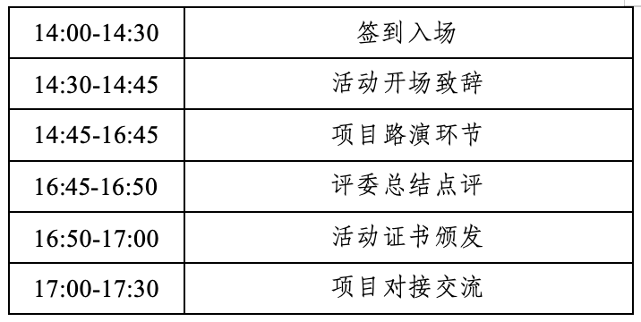 (五)活動(dòng)形式:采用線下路演模式,每個(gè)項(xiàng)目路演時(shí)長(zhǎng)20分鐘以內(nèi)(含15分鐘項(xiàng)目展示+5分鐘評(píng)委提問(wèn)環(huán)節(jié))。