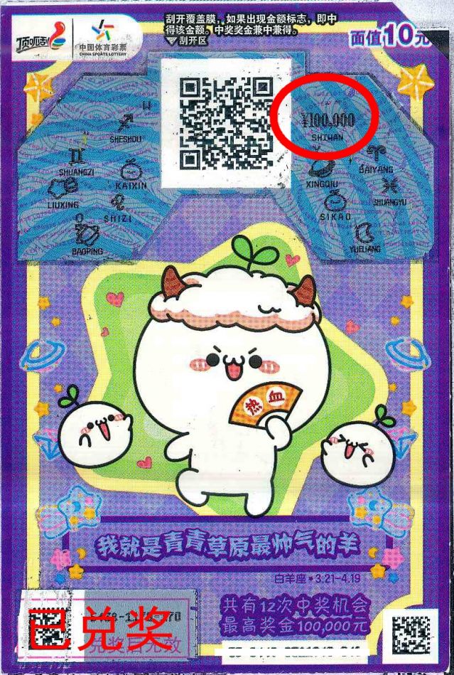 另一位幸運者來自中山市南區(qū)槎橋路朗晴假日17幢2卡的4418018278體彩實體店內(nèi)。購彩者趙先生(化名)以10元面值的體彩頂呱刮十二星座票種,獲得了最高獎金10萬元,為地方貢獻稅金2萬元。
